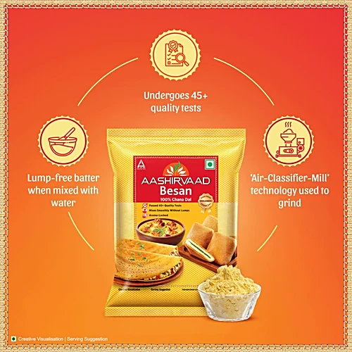 Aashirvaad Besan is made from 100% Bikaneri chana dal, harvested in the right conditions from the farms of Rajasthan. State-of-the-art ‘Air Classifier Mill’ technology helps seal in the aroma and freshness and ensures uniform granulation for a perfectly smooth batter. the delicious aroma and the rich colour will make your favourite besan dishes unforgettable!