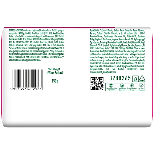 Be 100% sure to protect your skin from 100 illness-causing germs and bacteria. Dettol’s Skincare Germ Protection Bathing Soap bar keeps your skin healthy every day. The trusted germ-protection formula of Dettol soap acts like a barrier between your skin and a wide range of unseen germs.Dettol bathing soap keeps you fresh all-day long while the glycerine-rich formula gives a moisturised and healthy looking skin.