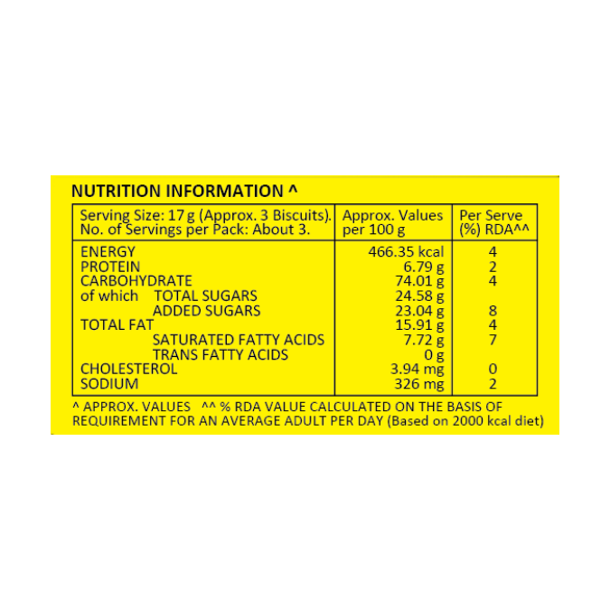Serving Size: 17 g (Approx. 3 Biscuits). No. of Servings per Pack: About 3. Approx. Values per 100 g Per Serve (%) RDA^^